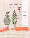 This is a mounted print taken from a freehand embroidery applique picture using vintage fabrics and stitched lines.